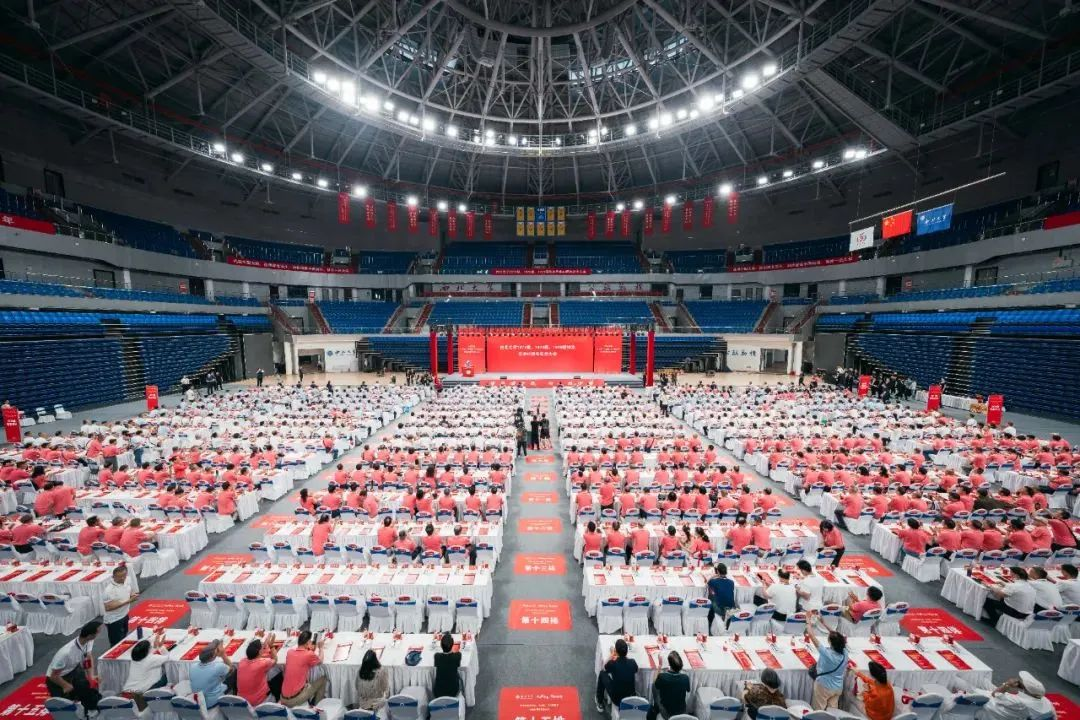 开始因为身体原因我想迟到一会,一看群里发的现场照片就不敢吱声了。承办过第十四届全运会项目的校体育馆已经盛装起来,灯火辉煌,宏大肃穆,像一艘即将启航的豪华邮轮。雪白的桌衣上800多人的红色桌椅一字排开,椅子上放着量身定制的T恤,大大小小的文件夹、会议流程、全体返校生花名册、一把雨伞、一支签名笔、连便签都是精制的。母校这是动员了多少人、付出了怎样的代价啊!
