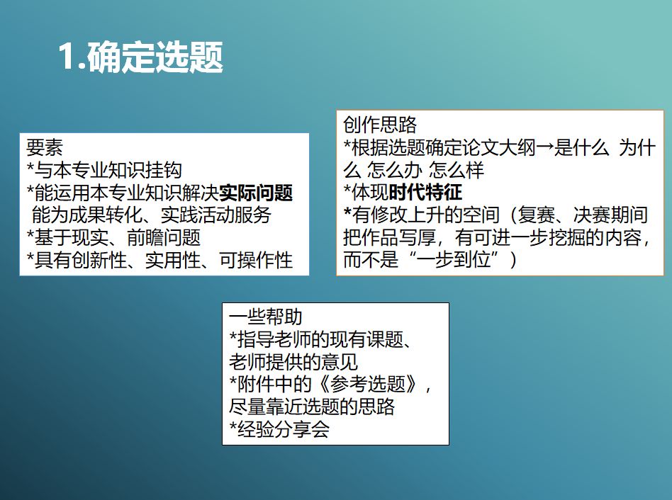唐雨姿同学的经验分享主要从确认选题、团队合作和作品修改润色三个方面展开,首先以自身作品为例,说明了选题需要具备的要素,即联系专业知识、关注现实问题。作品修改润色方面,提出要不断修改完善,提高作品质量,注重调研数据样本的广度、附件的丰富性。团队合作方面,强调了与指导老师沟通、合理分配任务的重要性。